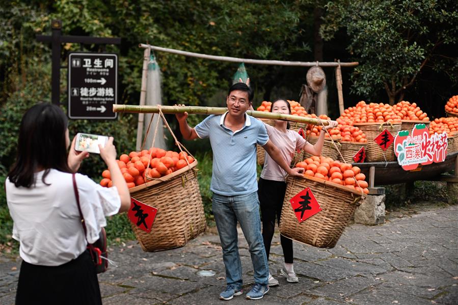 10月3日,游客在西溪國(guó)家濕地公園挑起道具“柿子”留影。據(jù)了解,西溪濕地內(nèi)共有柿子樹(shù)7000多棵,正值豐收的季節(jié)。 當(dāng)日是國(guó)慶假期第三天,大批游客來(lái)到位于杭州的西溪國(guó)家濕地公園游玩,在江南詩(shī)意的環(huán)境中休閑度假。 新華社記者 黃宗治 攝