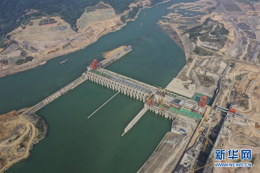 建設(shè)中的大藤峽水利樞紐工程(10月6日無(wú)人機(jī)拍攝)。節(jié)日期間,工人們?cè)谖挥趶V西桂平市西江流域黔江河段的大藤峽水利樞紐工程現(xiàn)場(chǎng)加緊施工。新華社記者曹祎銘攝