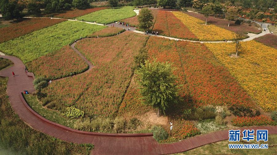 10月9日無人機(jī)拍攝的四季花海城市公園風(fēng)景。 秋日時節(jié),位于安徽省合肥市的四季花海城市公園花香四溢,色彩繽紛,成為游客和市民休閑游玩的好去處。 新華社記者 張端 攝