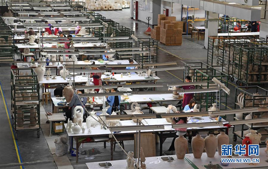 在江西景德鎮(zhèn)法藍(lán)瓷實(shí)業(yè)有限公司,工人們?cè)谔沾缮a(chǎn)車間工作(2017年4月8日攝)。新華社記者 萬象 攝