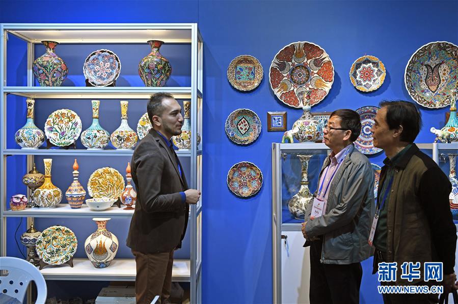 在中國景德鎮(zhèn)國際陶瓷博覽會的現(xiàn)場,來自土耳其的參展商(左一)與參觀者交流(2018年10月18日攝)。新華社記者 萬象 攝