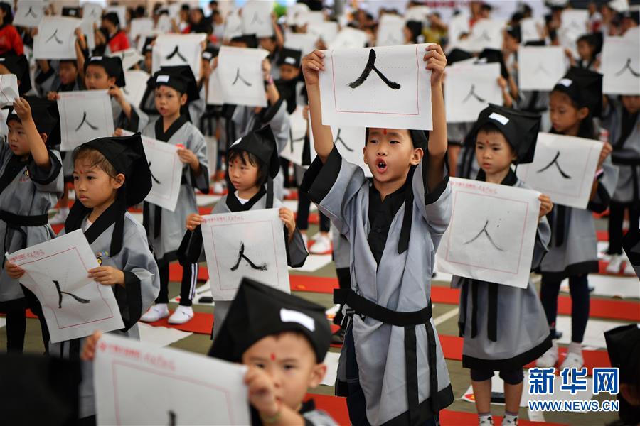 10月13日,參加儀式的小朋友在宣讀開(kāi)筆誓言。當(dāng)日,??诤?huà)少兒藝術(shù)中心為500名小朋友舉行“開(kāi)筆禮”,通過(guò)“點(diǎn)朱砂,啟智慧”“習(xí)書(shū)法,描人字”等儀式讓孩子們體驗(yàn)中國(guó)傳統(tǒng)文化。新華社記者郭程攝