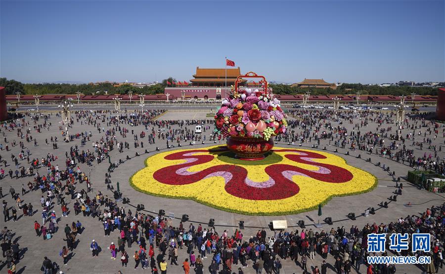 這是10月14日拍攝的天安門廣場(chǎng)中心花壇。 10月14日,以“花果籃”為主造型的天安門廣場(chǎng)中心花壇吸引了眾多游客參觀拍照。“花果籃”的夜景更是流光溢彩,絢爛迷人。 新華社記者 殷剛 攝