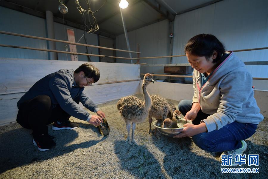 村民許俊鵬和妻子在照料小鴕鳥(10月14日攝)。2017年初,高谷堆村貧困戶許俊鵬一家在扶貧干部的幫助下開始嘗試養(yǎng)殖鴕鳥創(chuàng)收。目前,許俊鵬一家已建成擁有20余只鴕鳥的養(yǎng)殖基地,平均年收入近4萬(wàn)元。 新華社記者 曹陽(yáng) 攝
