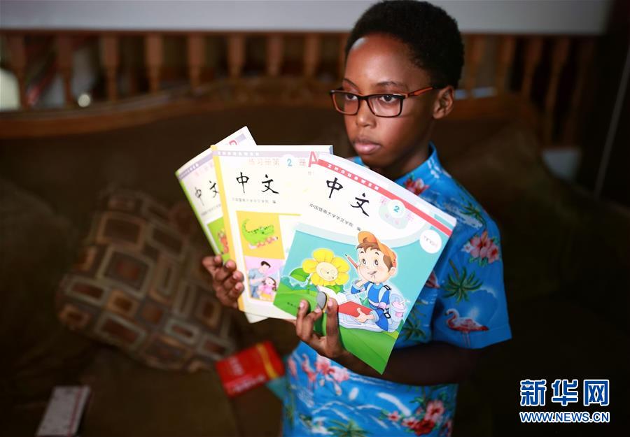 9月25日,在美國(guó)芝加哥,卡亞·恩朱比展示漢語(yǔ)課本。 新華社記者 汪平 攝