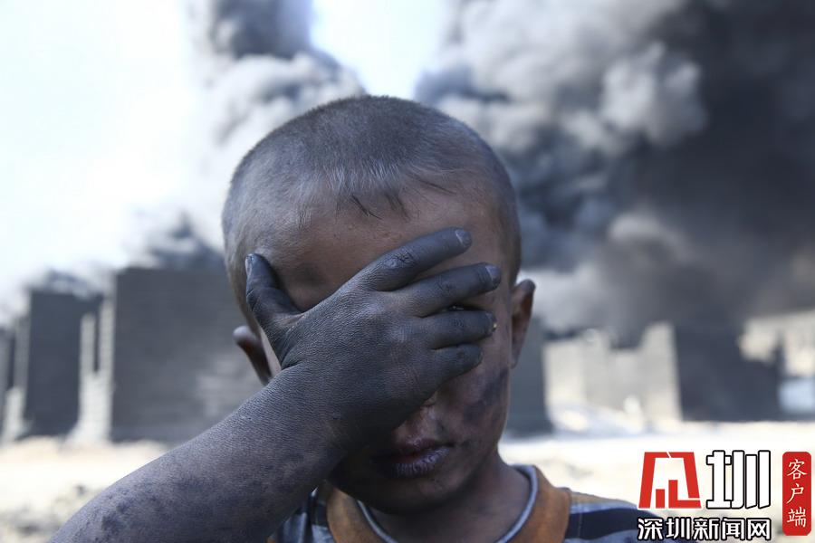 當?shù)貢r間2016年10月25日,伊拉克摩蘇爾,遭伊斯蘭國縱火的油井冒出濃濃黑煙,嚴重影響了鎮(zhèn)子里的生活,孩子們的手和臉都被熏黑了。伊拉克政府軍于10月16日正式展開收復摩蘇爾的戰(zhàn)役。