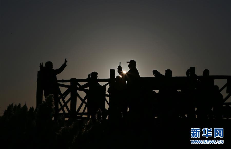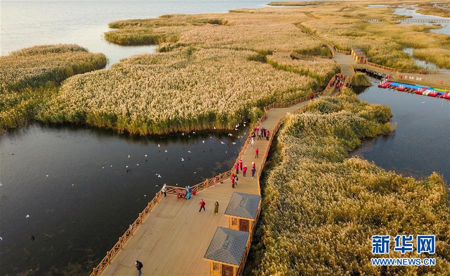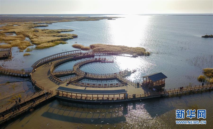 10月17日,游客在居延海岸邊的木棧道上觀賞水鳥。新華社記者 彭源 攝
