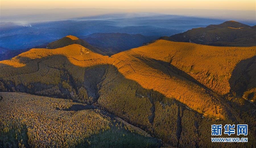 朝霞映照下的好地方林場(chǎng)(10月8日無人機(jī)拍攝)。新華社記者陶明攝