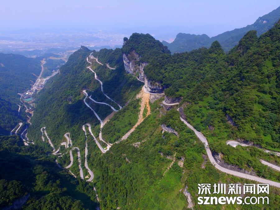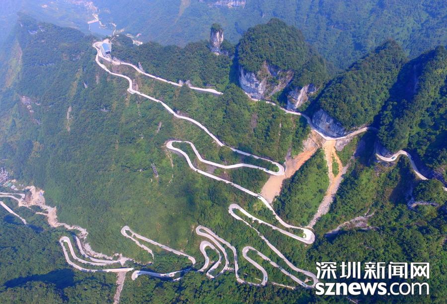 天門山盤山公路位于湖南省張家界市境內(nèi)的國家森林公園天門山上,盤山公路全長10.77公里,海拔從200米急劇提升到1300米,大道兩側(cè)絕壁千仞,空谷幽深,共計99個彎,180度急彎此消彼長,似玉帶環(huán)繞,航拍鏡頭下蜿蜒曲折的道路彎彎緊連,層層迭起,宛如迷宮般的“納斯卡線條”,被譽(yù)為“天下第一公路奇觀”,同時它也是世界上最危險的十大公路之一。