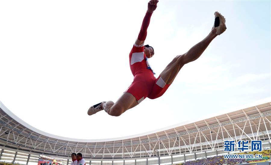 10月24日,中國選手王嘉男在比賽后慶祝。 當(dāng)日,在武漢舉行的第七屆世界軍人運(yùn)動會田徑項(xiàng)目男子跳遠(yuǎn)決賽中,中國選手王嘉男、黃常洲分別以8米15和8米12的成績獲得冠亞軍。 新華社記者金良快攝