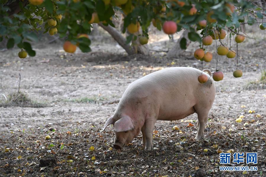 10月24日,在敦煌市郭家堡鎮(zhèn)一處果園,一頭豬在果樹(shù)下覓食。新華社記者 馬寧 攝