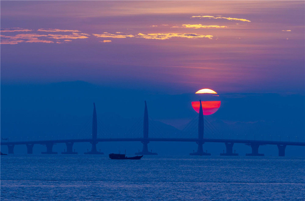 2018年10月22日早晨,從廣東珠海市的情侶路向東眺望,一輪紅日從東方冉冉升起,將港珠澳大橋映射得格外迷人。“超級工程”港珠澳大橋?qū)⒂?4日上午9時(shí)正式通車。張煒(香港分社)/中新社/視覺中國