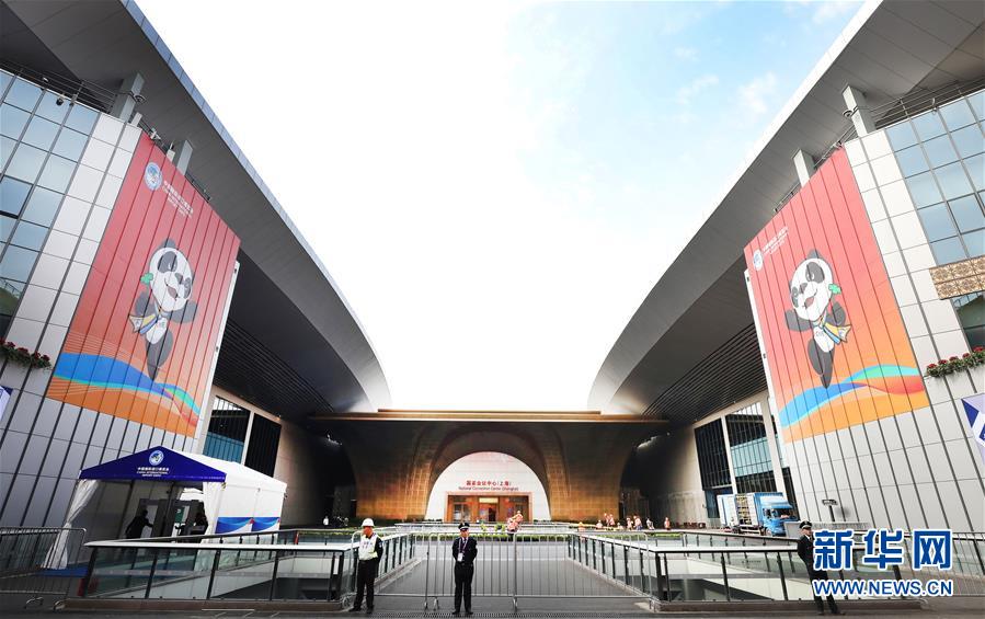 10月25日,位于國展中心內(nèi)的國家會(huì)議中心入口處張貼了醒目的進(jìn)博會(huì)吉祥物熊貓進(jìn)寶裝飾。 新華社記者 方喆攝
