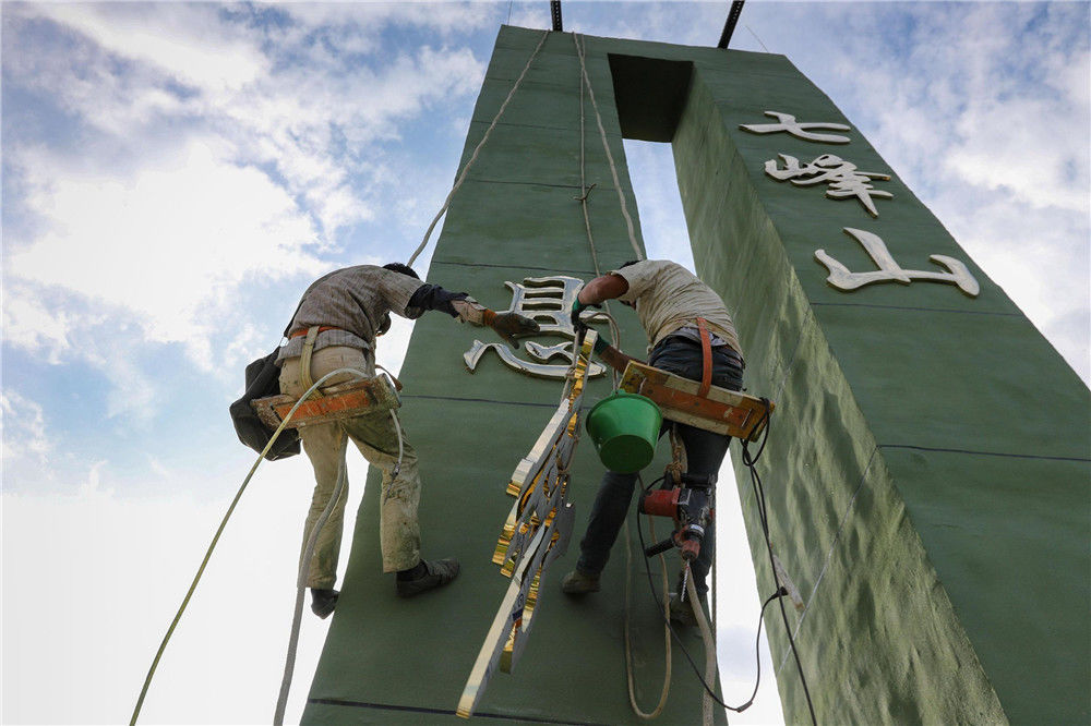 2019年9月20日,從落差198米懸崖上伸出周長(zhǎng)60米懸空的“高空玻璃懸廊”在河南南陽(yáng)七峰山落成,該玻璃懸廊名為“云頂之心”。圖為建筑工人進(jìn)行收尾工作。王中舉(河南分社)/中新社/視覺(jué)中國(guó)編輯/康娜