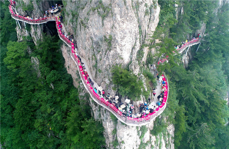 2019年6月24日,河北省邯鄲市東太行云端棧道天脊攬勝。東太行景區(qū)位于武安市境內(nèi)太行山東麓,登山棧道全部在峭壁上,游人登山如在云端漫步。金書(shū)懷/視覺(jué)中國(guó)