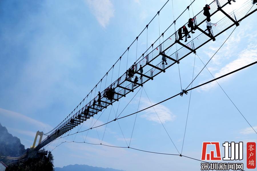 2017年11月5日,游客走在湖北省保康縣歇馬鎮(zhèn)九路寨景區(qū)戰(zhàn)口河人行懸索橋上觀光。