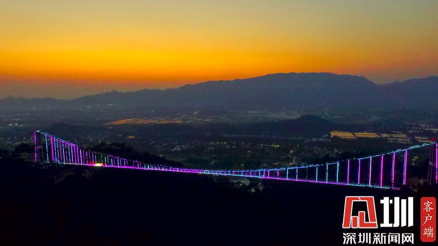 2018年10月7日,廣東佛山。網(wǎng)友紛紛稱(chēng)佛山南丹山玻璃橋是廣東最美玻璃橋。漸漸地,金燦燦的陽(yáng)光變?yōu)榱顺赛S色,開(kāi)始變得柔和,嫵媚動(dòng)人,給美麗恬靜的群山抹上一層金光。太陽(yáng)開(kāi)始脫去華麗的金絲紗裙,換上了橘黃色的時(shí)尚。玻璃橋也穿上了端莊典雅的晚禮服,露出那像蒙娜麗莎一樣迷人的笑容。