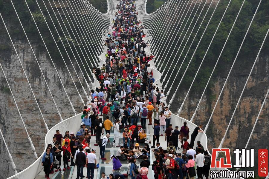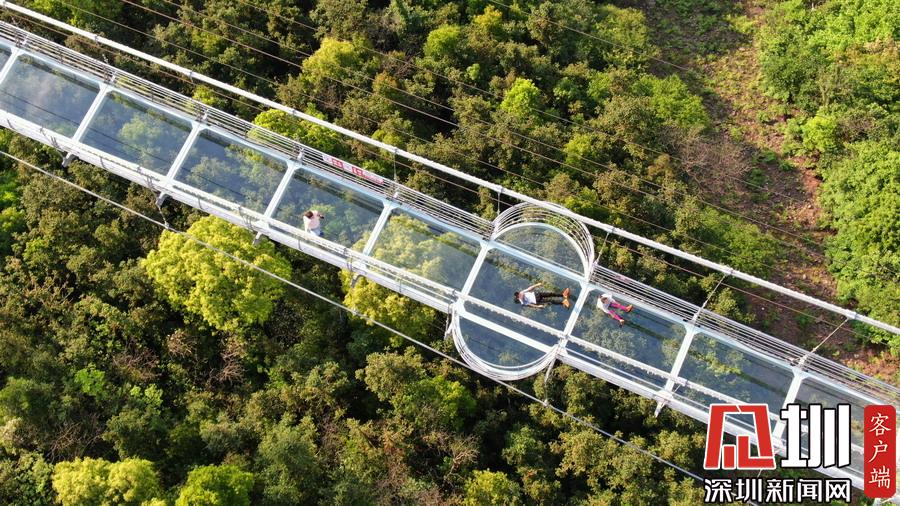 2019年4月24日,湖南張家界大峽谷玻璃橋上,游客們擺出各種姿勢(shì)拍照。剛開(kāi)始,游客們?cè)诙虝旱目謶种?,隨之而來(lái)的是滿(mǎn)滿(mǎn)的興奮,男女老少紛紛在這座懸在300多米高空中的全透明玻璃橋上不停拍照,從一開(kāi)始走上橋緊張的不敢踩在玻璃上,到最后在玻璃橋上的各種躺和趴,各種姿勢(shì)各種創(chuàng)意各種拍攝,游客們完全忘我地開(kāi)心游玩。張家界大峽谷玻璃橋,是世界首座斜拉式高山峽谷玻璃橋,玻璃橋全長(zhǎng)430米,寬6米,橋身距離谷底垂直落差300米,大橋表面由99塊透明玻璃鋪設(shè)而成,整個(gè)工程無(wú)鋼筋混凝土橋墩。
