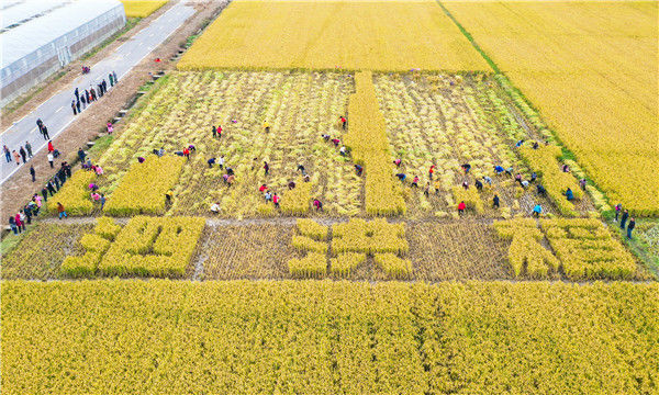 2019年10月26日,江蘇省宿遷市泗洪縣在稻米小鎮(zhèn)石集鄉(xiāng)舉行具有地方特色的割稻比賽,近60名選手在金色稻田揮舞銀鐮、緊張角逐。張連華/視覺中國(guó)