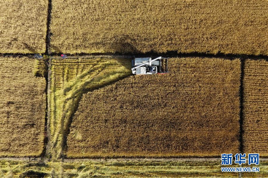 在太原市晉源區(qū)赤橋村,收割機(jī)在稻田里作業(yè)(10月28日無人機(jī)拍攝)。新華社記者詹彥攝