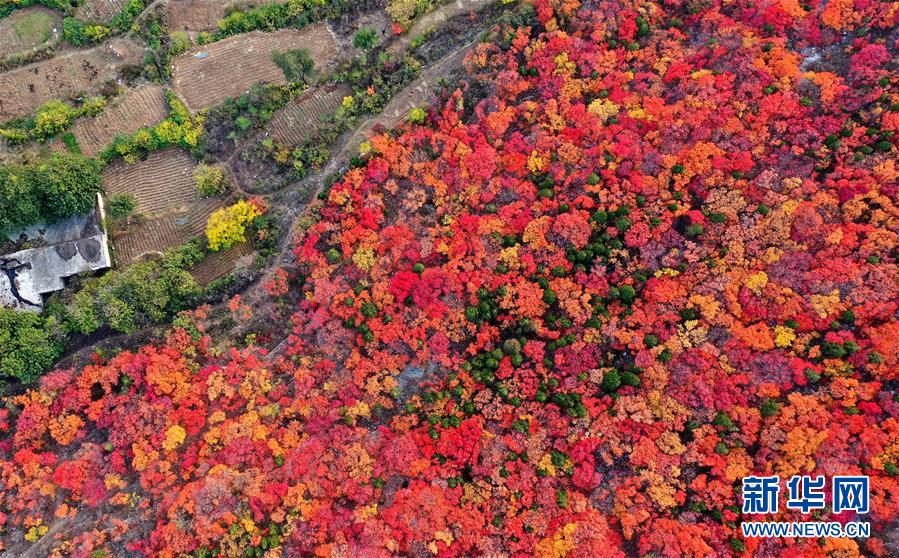 濟(jì)南蝎子山上火紅的黃櫨樹林(11月4日無人機拍攝)。 新華社記者 朱崢 攝