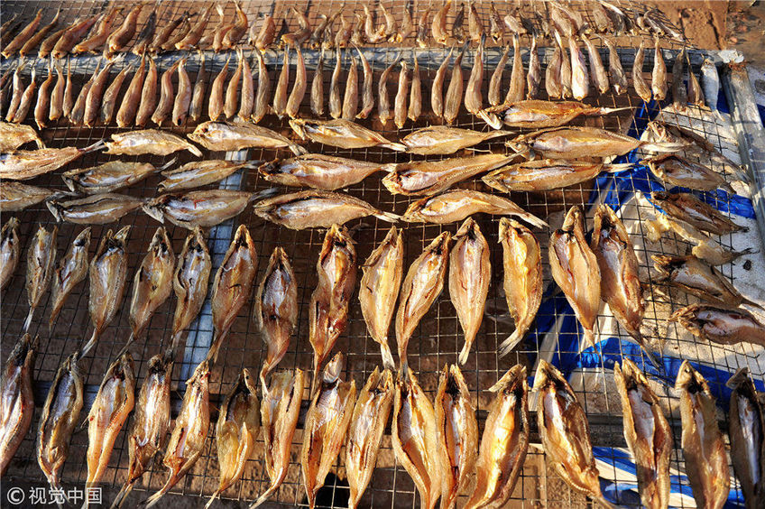 在暖陽之下,成片晾曬的海魚干成為了漁家一道獨具特色的民俗景象。