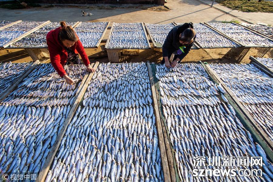 連日來,秋風颯爽,艷陽高照,當地漁村迎來豐收季,漁民們在鄱陽湖畔的漁港岸邊和屋前屋后晾曬魚蝦,忙的不亦樂乎。
