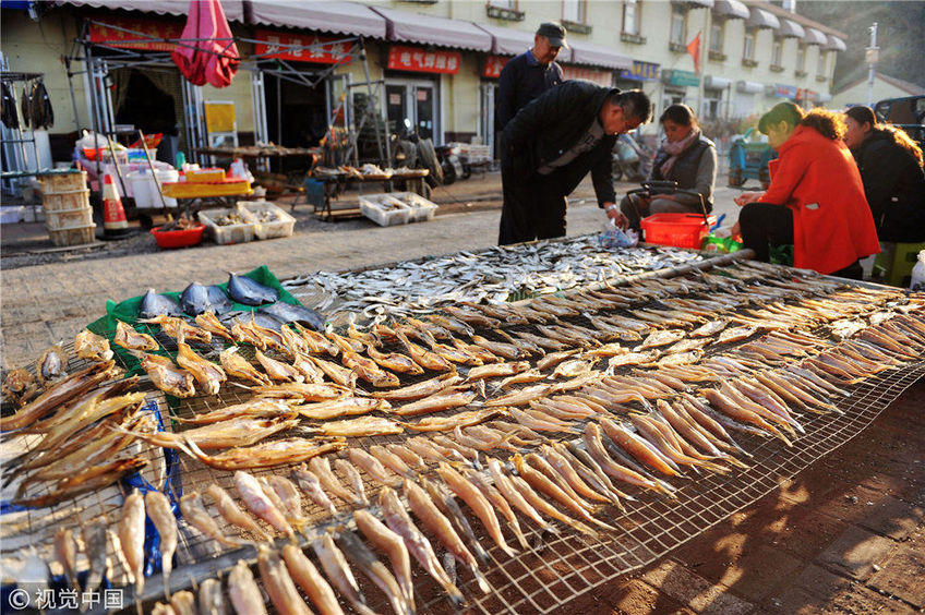 漁民在山東省青島西海岸新區(qū)瑯琊鎮(zhèn)瑯琊港碼頭上晾曬海魚。