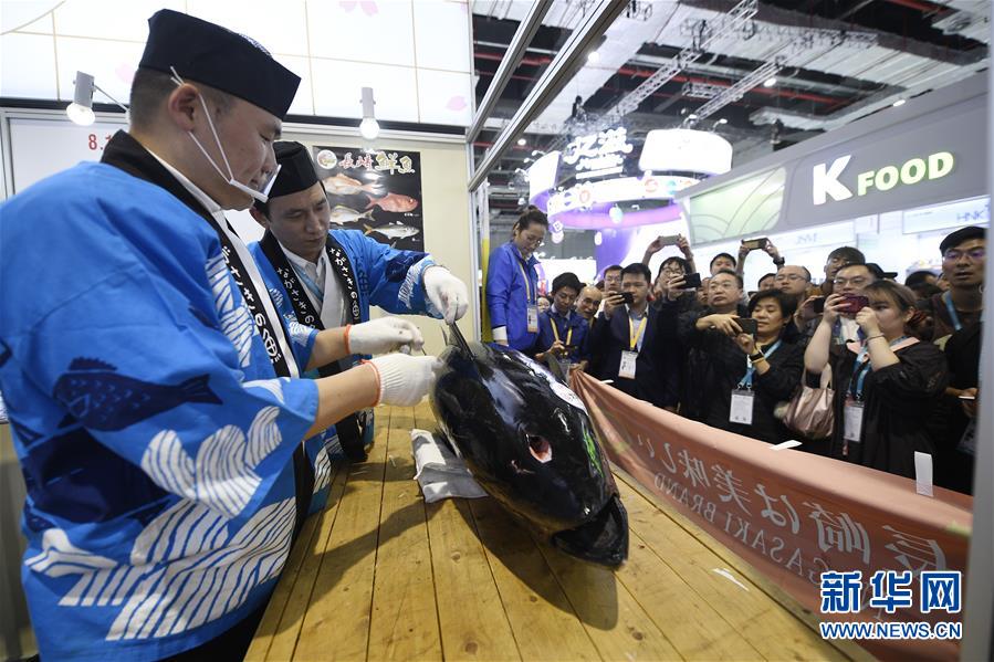 11月7日,來(lái)自日本長(zhǎng)崎魚(yú)市株式會(huì)社的專業(yè)切魚(yú)師傅為解體70公斤藍(lán)鰭金槍魚(yú)做準(zhǔn)備。第二屆中國(guó)國(guó)際進(jìn)口博覽會(huì)正在上海國(guó)家會(huì)展中心舉行。博覽會(huì)的食品及農(nóng)產(chǎn)品展區(qū)里匯集了來(lái)自世界各地的美食,同時(shí)也上演各種精彩美食秀。11月7日,來(lái)自日本長(zhǎng)崎魚(yú)市株式會(huì)社的專業(yè)切魚(yú)師傅現(xiàn)場(chǎng)解體一條70公斤的藍(lán)鰭金槍魚(yú),吸引大量參觀者觀看、品嘗。新華社記者王鵬攝