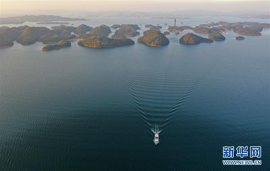 11月9日無人機(jī)拍攝的廬山西海。 當(dāng)日,落日余暉下的江西廬山西海山青水藍(lán),美不勝收。 新華社記者 周密 攝