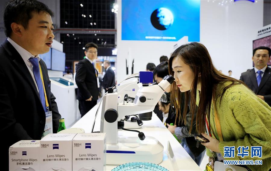 在第二屆進博會裝備展區(qū)德國蔡司公司展臺,參觀者體驗一款數(shù)碼互動教學系統(tǒng)產(chǎn)品(11月8日攝)。新華社記者方喆攝