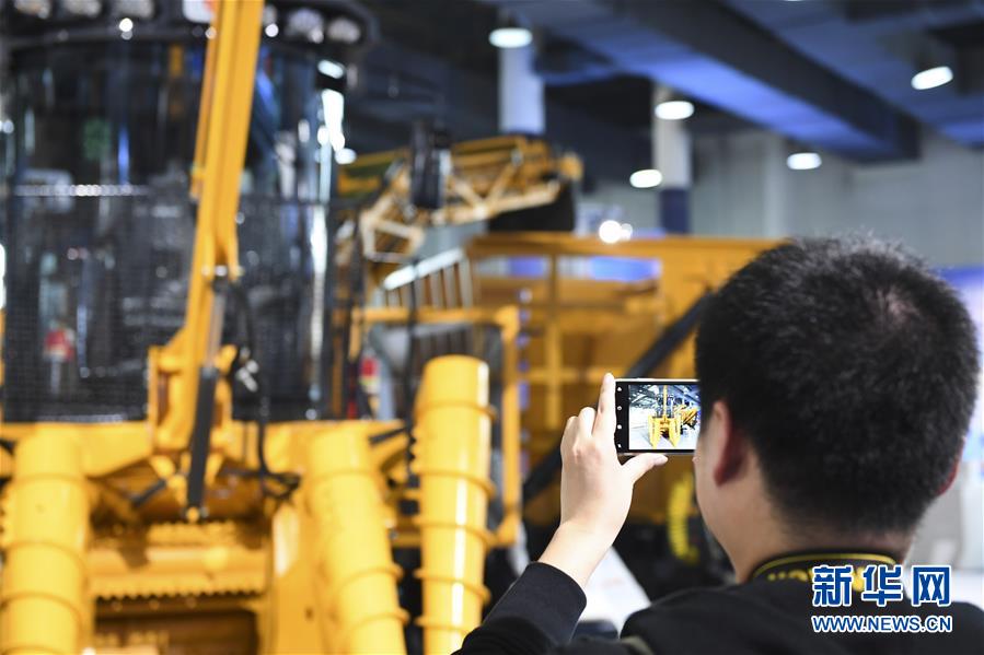 11月16日,參觀者在展會現(xiàn)場參觀甘蔗收割機械設(shè)備。新華社記者曹祎銘攝