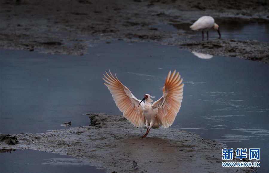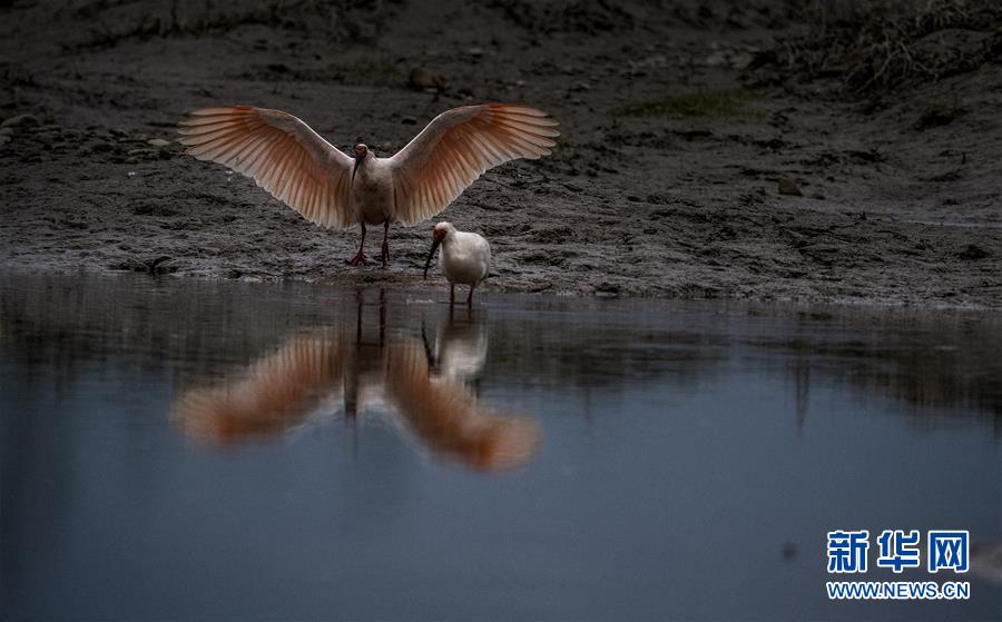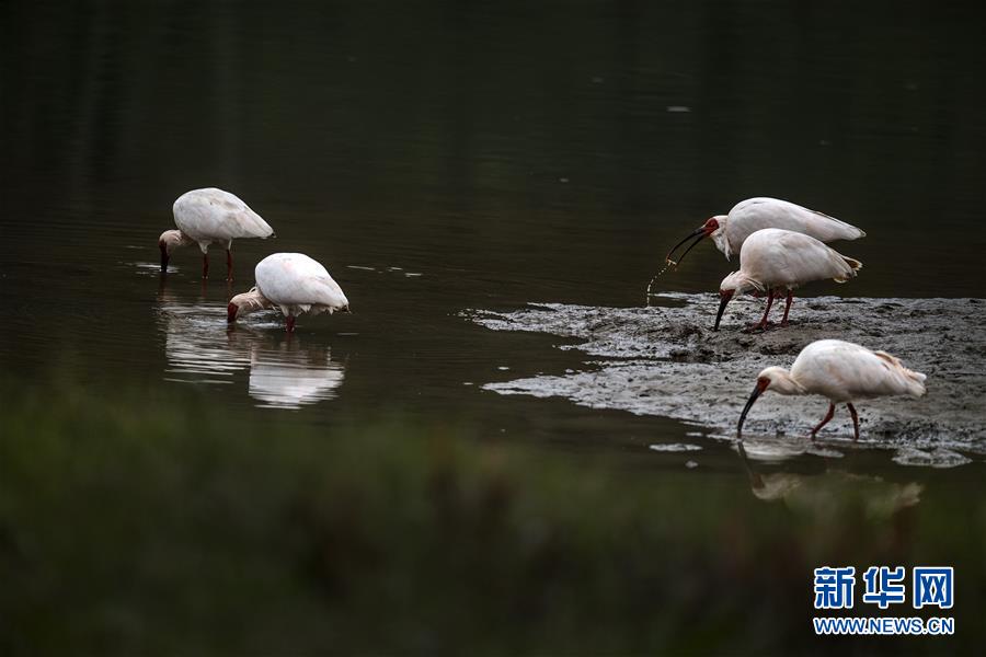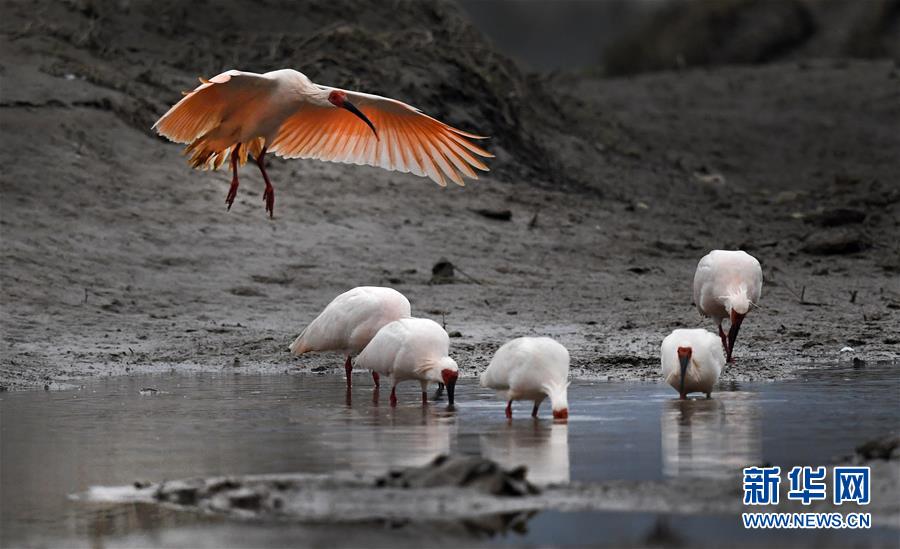 11月19日,朱鹮在陜西省漢中市西鄉(xiāng)縣峽口鎮(zhèn)井壩村牧馬河里覓食。  新華社記者陶明攝