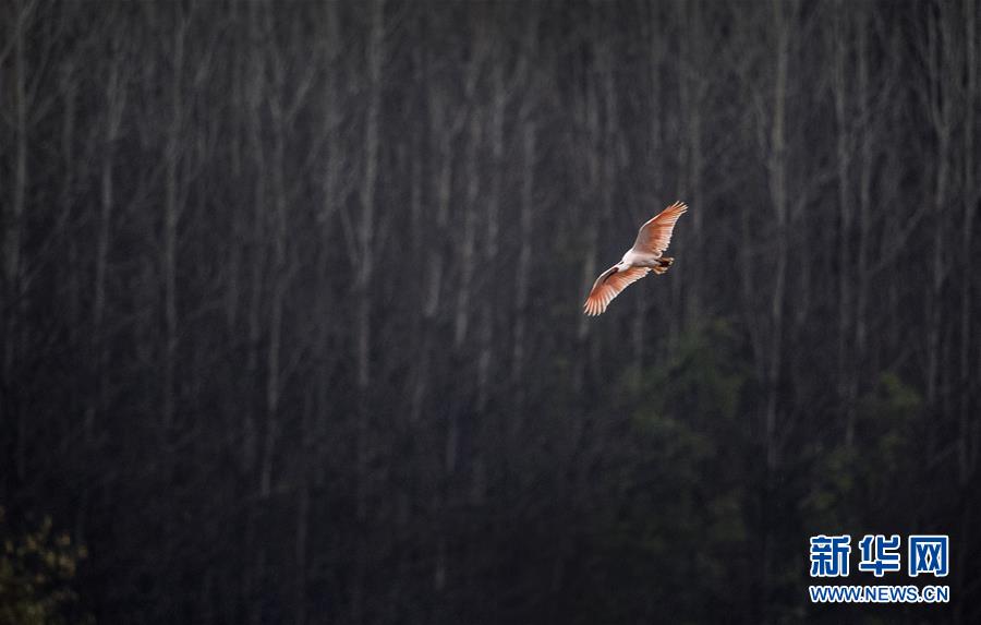 11月19日,朱鹮飛翔在陜西省漢中市西鄉(xiāng)縣峽口鎮(zhèn)牧馬河畔。  新華社記者陶明攝