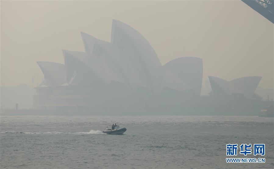 11月21日,在澳大利亞悉尼,一艘快艇駛過濃煙籠罩下的悉尼歌劇院。澳大利亞東部近期林火肆虐,悉尼所在的新南威爾士州自進入今年林火季以來,過火面積超過100萬公頃。林火造成悉尼濃煙圍城,市民生活受到影響。新華社記者白雪飛攝