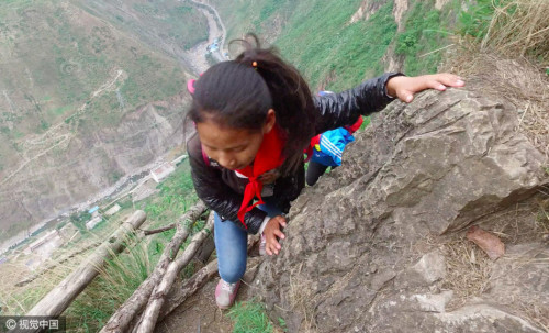 上學(xué)的孩子都背著沉沉的書(shū)包,大多數(shù)是女孩,15個(gè)孩子在三個(gè)家長(zhǎng)的保護(hù)下,大約用了2個(gè)小時(shí),到達(dá)“懸崖村”。上山容易下山難,遇到雨雪天氣,村里人就不再外出了。圖片來(lái)源:視覺(jué)中國(guó)