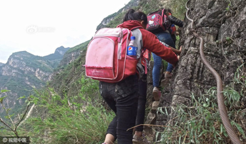 上學的孩子都背著沉沉的書包,大多數(shù)是女孩,15個孩子在三個家長的保護下,大約用了2個小時,到達“懸崖村”。上山容易下山難,遇到雨雪天氣,村里人就不再外出了。圖片來源:視覺中國