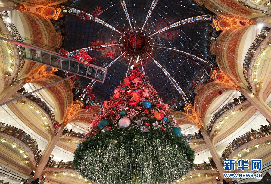 這是11月24日在法國巴黎老佛爺百貨公司拍攝的點燈后的巨型圣誕樹。 新華社記者高靜攝