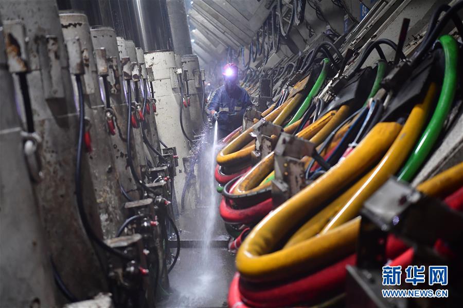 11月26日,在上灣煤礦12402綜采面內,工作人員對液壓支架區(qū)域進行沖洗清潔。 新華社記者 邵瑞 攝