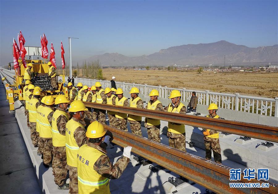 11月1日,中鐵三局的工人在京張高鐵河北懷來段鋪軌現場工作。