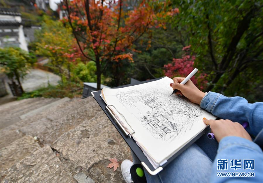 游客在婺源縣江灣鎮(zhèn)篁嶺村寫生(11月7日攝)。新華社記者胡晨歡攝