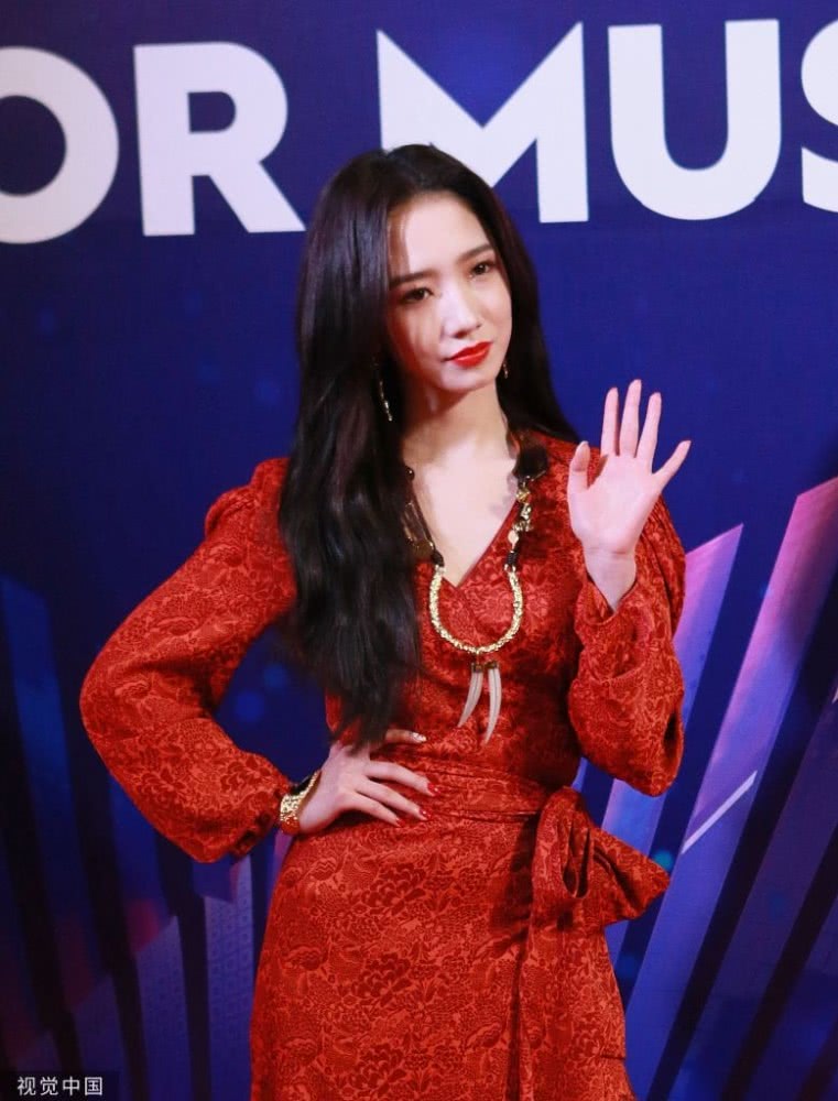 孟美岐身穿大紅色長裙搭配波浪卷發(fā),大走港風(fēng)美艷動(dòng)人。