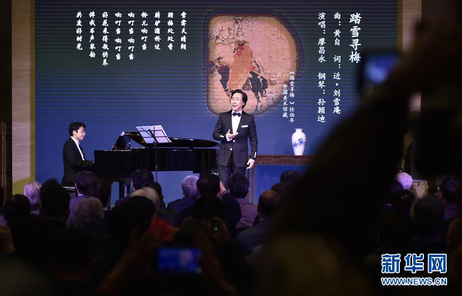 12月10日晚,廖昌永在音樂會(huì)上演唱《踏雪尋梅》。 當(dāng)晚,中國(guó)古典詩(shī)詞與書畫——廖昌永中國(guó)藝術(shù)歌曲獨(dú)唱音樂會(huì)在北京中國(guó)美術(shù)館舉行。 新華社記者 魯鵬 攝
