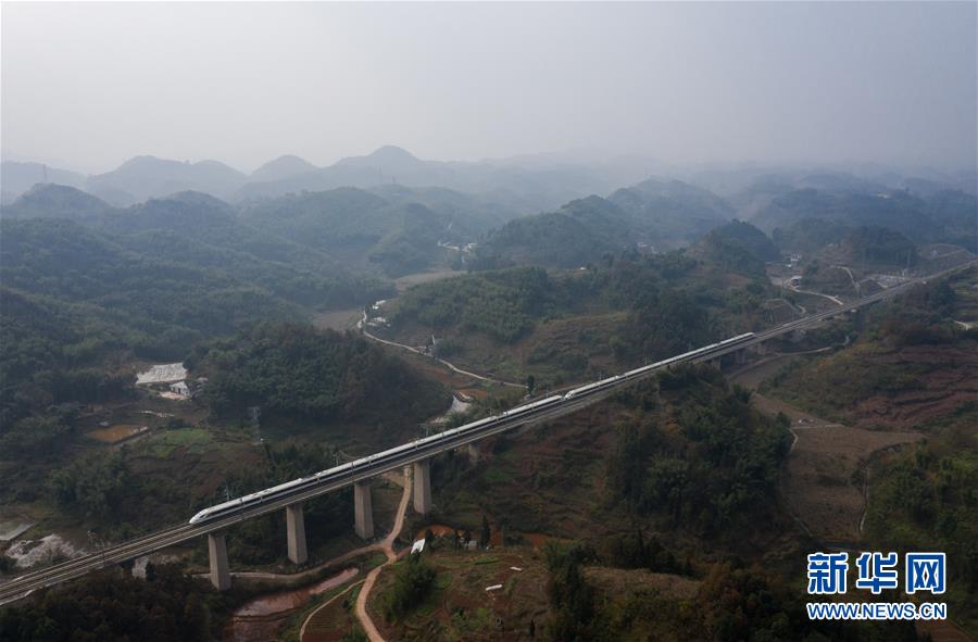 12月16日,C6046次列車通過成貴高鐵興文縣段(無人機(jī)拍攝)。新華社記者江宏景攝