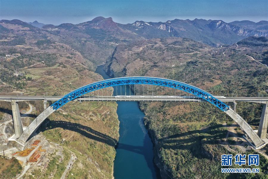 12月16日,一列動(dòng)車組列車從成貴高鐵鴨池河特大橋上駛過(無人機(jī)拍攝)。新華社記者歐東衢攝