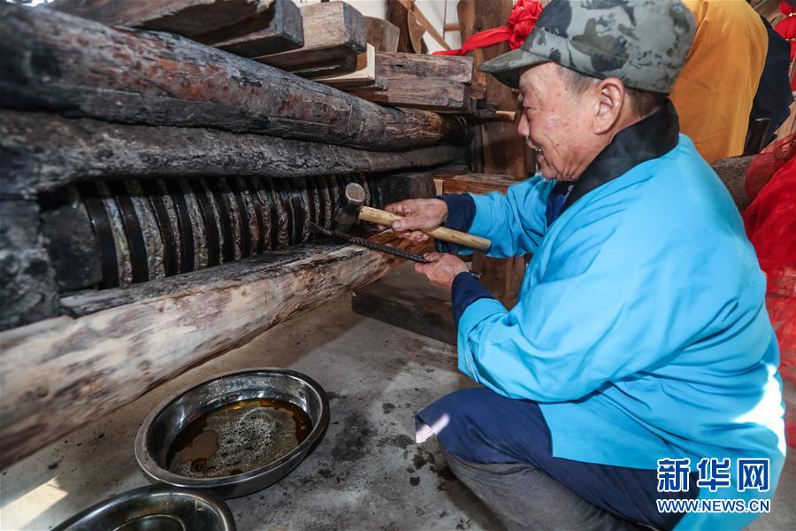 12月15日,老油坊的木龍中經過壓榨的茶餅開始出油。 新華社記者 徐昱 攝