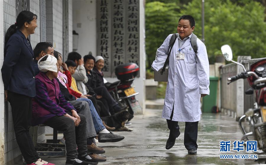 5月28日,何永清(右)一大早出門“送醫(yī)上門”后回到村衛(wèi)生室時,門口排滿了等待就診的村民。何永清是陜西省略陽縣樂素河鎮(zhèn)瓦房村衛(wèi)生室的一名村醫(yī),幼年時因車禍?zhǔn)ビ冶邸?006年7月從漢中市衛(wèi)校畢業(yè)后,他選擇回到山大溝深的秦嶺腹地故鄉(xiāng)工作。十多年來,何永清堅(jiān)守在基層衛(wèi)生第一線,鄉(xiāng)親們親切地稱他為“我們的獨(dú)臂村醫(yī)”。新華社記者陶明攝