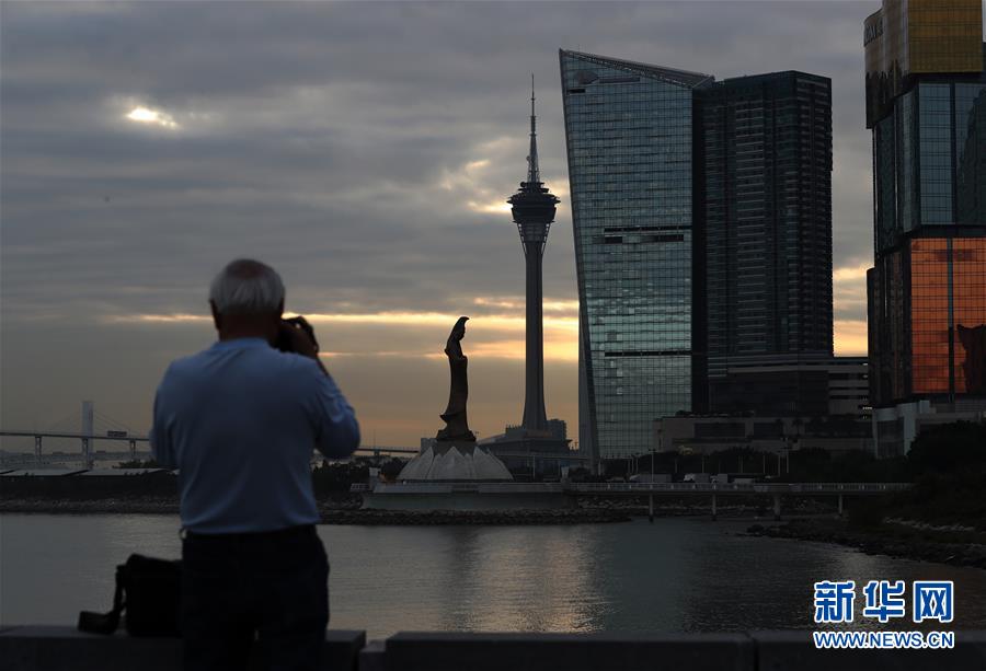 落日時分,一名男子在澳門海邊拍攝照片(12月17日拍攝)。新華社記者李鋼攝