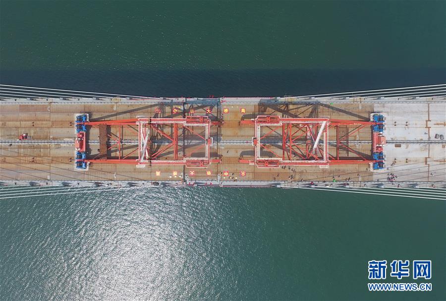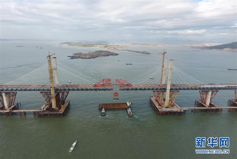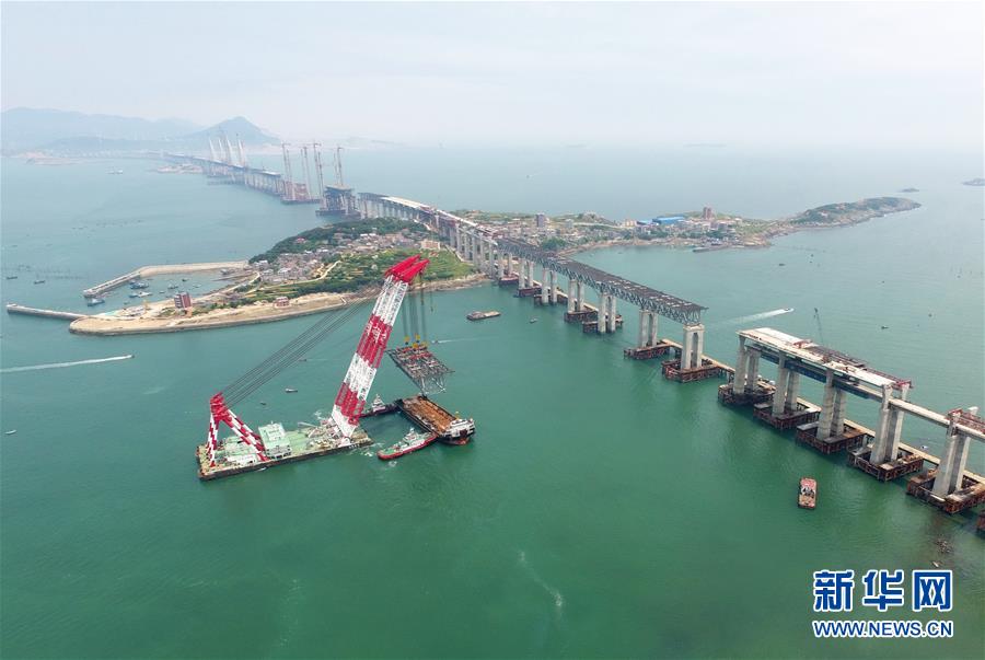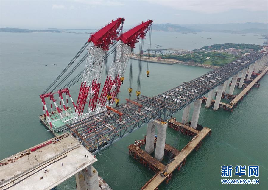 9月21日,平潭海峽公鐵大橋鼓嶼門(mén)航道橋的鋼桁梁在吊裝中(無(wú)人機(jī)拍攝)。9月25日上午,隨著一段長(zhǎng)17米、重473噸的鋼桁梁被精確固定到位,總長(zhǎng)16.34公里的平潭海峽公鐵大橋合龍貫通。平潭海峽公鐵大橋是福州至平潭鐵路控制性工程,也是“十三五”規(guī)劃中北京至臺(tái)灣高鐵的先期工程。大橋起于福州市長(zhǎng)樂(lè)區(qū),“踏”過(guò)四座小島后抵達(dá)中國(guó)第五大島平潭,上層設(shè)計(jì)為時(shí)速100公里的六車道高速公路,下層為設(shè)計(jì)時(shí)速200公里的高鐵。據(jù)福建福平鐵路公司介紹,大橋計(jì)劃2020年正式通車。在六年建設(shè)過(guò)程中,平潭海峽公鐵大橋所應(yīng)用研發(fā)的多項(xiàng)技術(shù)、裝備創(chuàng)下國(guó)內(nèi)外紀(jì)錄。新華社記者林善傳攝