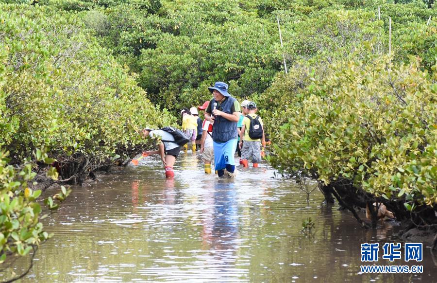 海南東寨港國(guó)家級(jí)自然保護(hù)區(qū)林業(yè)工程師馮爾輝(前)在保護(hù)區(qū)內(nèi)為學(xué)生進(jìn)行講解(7月16日攝)。 馮爾輝2009年大學(xué)畢業(yè)后來(lái)到保護(hù)區(qū)工作,小時(shí)候他家就住在紅樹林邊上,他從小和紅樹林打交道,喜歡動(dòng)植物和鳥類。外貿(mào)專業(yè)畢業(yè)的他邊工作邊學(xué)習(xí),目前主要從事鳥類監(jiān)測(cè)、紅樹林保育、自然教育等工作。“紅樹林看著我長(zhǎng)大”,馮爾輝說(shuō),濕地保護(hù)的工作非常有意義。 新華社發(fā)